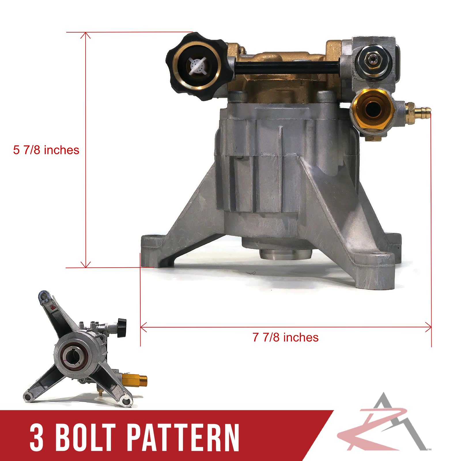 - FEATURE: Maximum Pressure: 3100 PSI. Max Flow: 2.5 GPM. Max Pump Speed: 3400 RPM. Shaft Diameter: 7/8" Shaft. 3 Bolt Pattern: 7 11/16” x 6 3/16” x 6 7/16” & 4" Center to Each Outer Hole. Max Water Temperature: 140° F. Inlet Connection Type: Standard Garden Hose. Outlet Tube Connection: 22mm Male. Chemical Hose - Inner Diameter: 1/4" (6mm). Outer Diameter: 3/8" (9mm). Length: 5'. Material: Rubber. Keyway - Overall Dimensions: 3/16" x 1/4" x 1 1/8"; Refer to images 2 and 3 for more information. This is the EZ version, which has the outlet facing the front