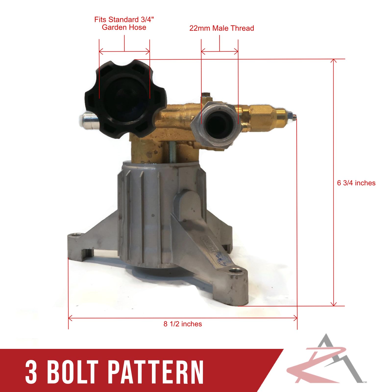 - Specs - Max Pressure: 2800 PSI. Max Flow: 2.5 GPM. Max Pump Speed: 3400 RPM. Shaft Size: 7/8". 3 Bolt Pattern: 7 11/16" x 6 3/16" x 6 7/16" & 4" from center to center of each outer hole. Max Temp: 140 F. Inlet Type: 3/4" GHA. Outlet Type: 22mm x 14mm. Oil Capacity: 2.2oz. Refer to images 2 & 3 for more information